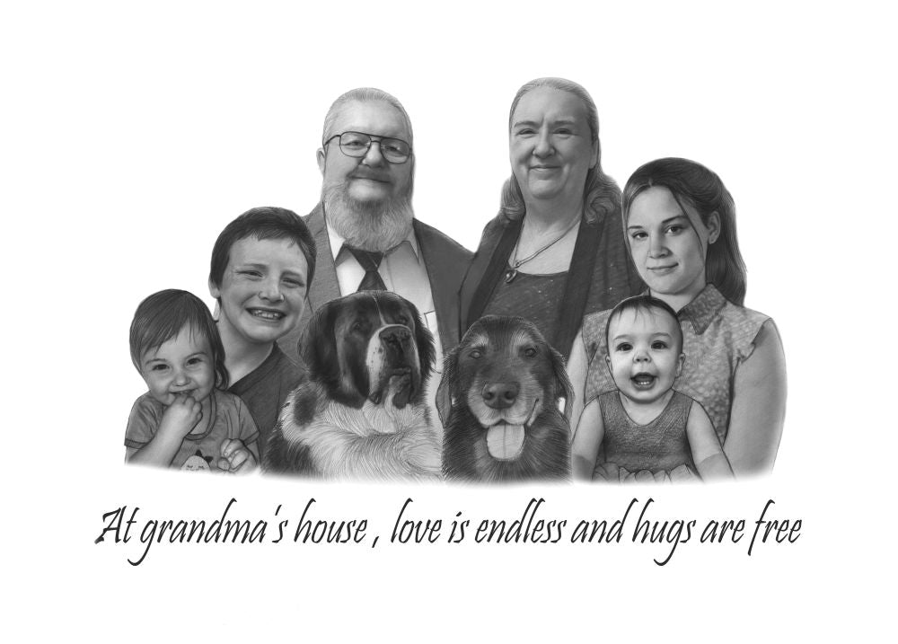 Our black and white portraits are a drawing style that offers a classic look and our lowest cost drawing option. These are particularly suited for more serious or classy drawings or those where we’ve been asked to draw from black & white photos.